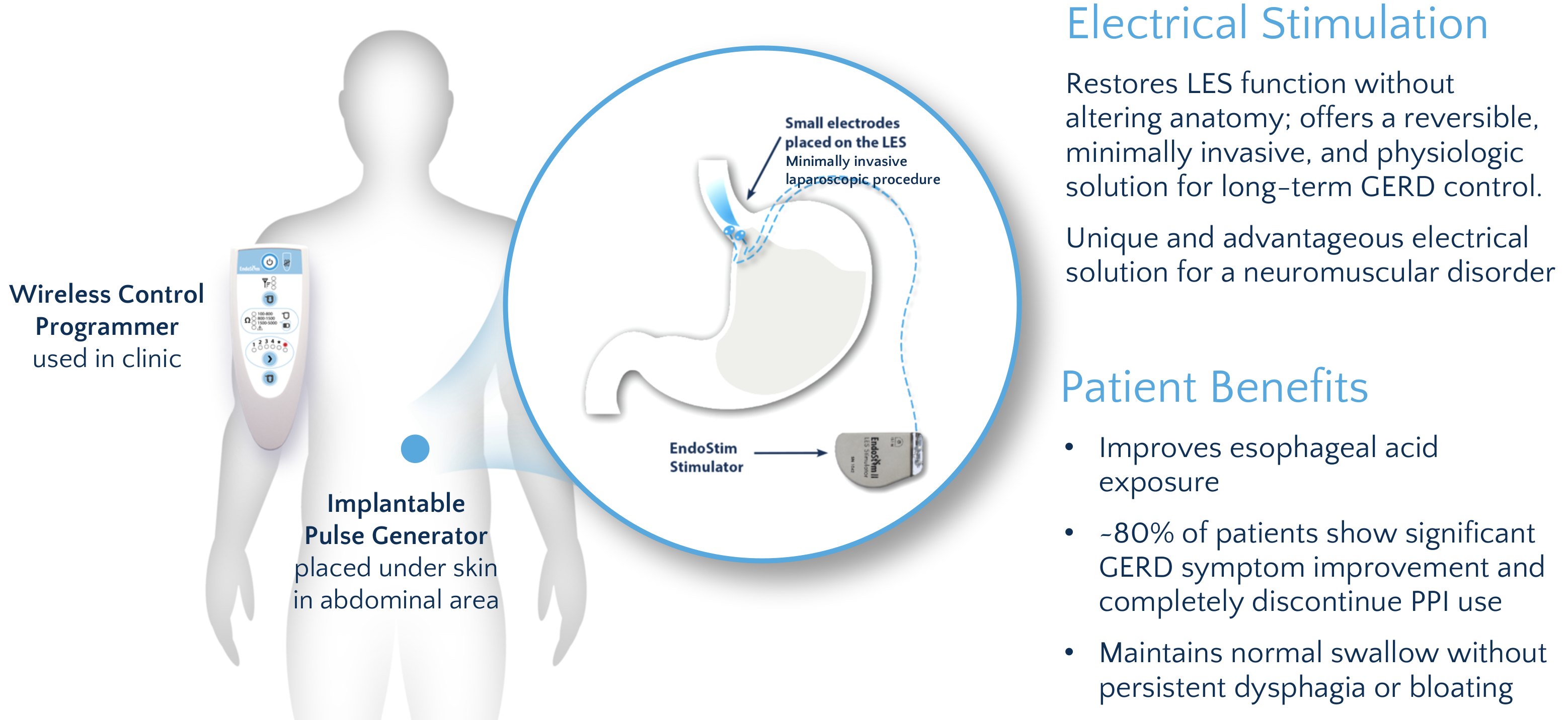 The EndoStim System is designed to provide long-term reflux control by automatically delivering mild electrical signals throughout the day to the patient’s weak or dysfunctional lower esophageal sphincter (LES) muscle, the underlying cause of GERD.